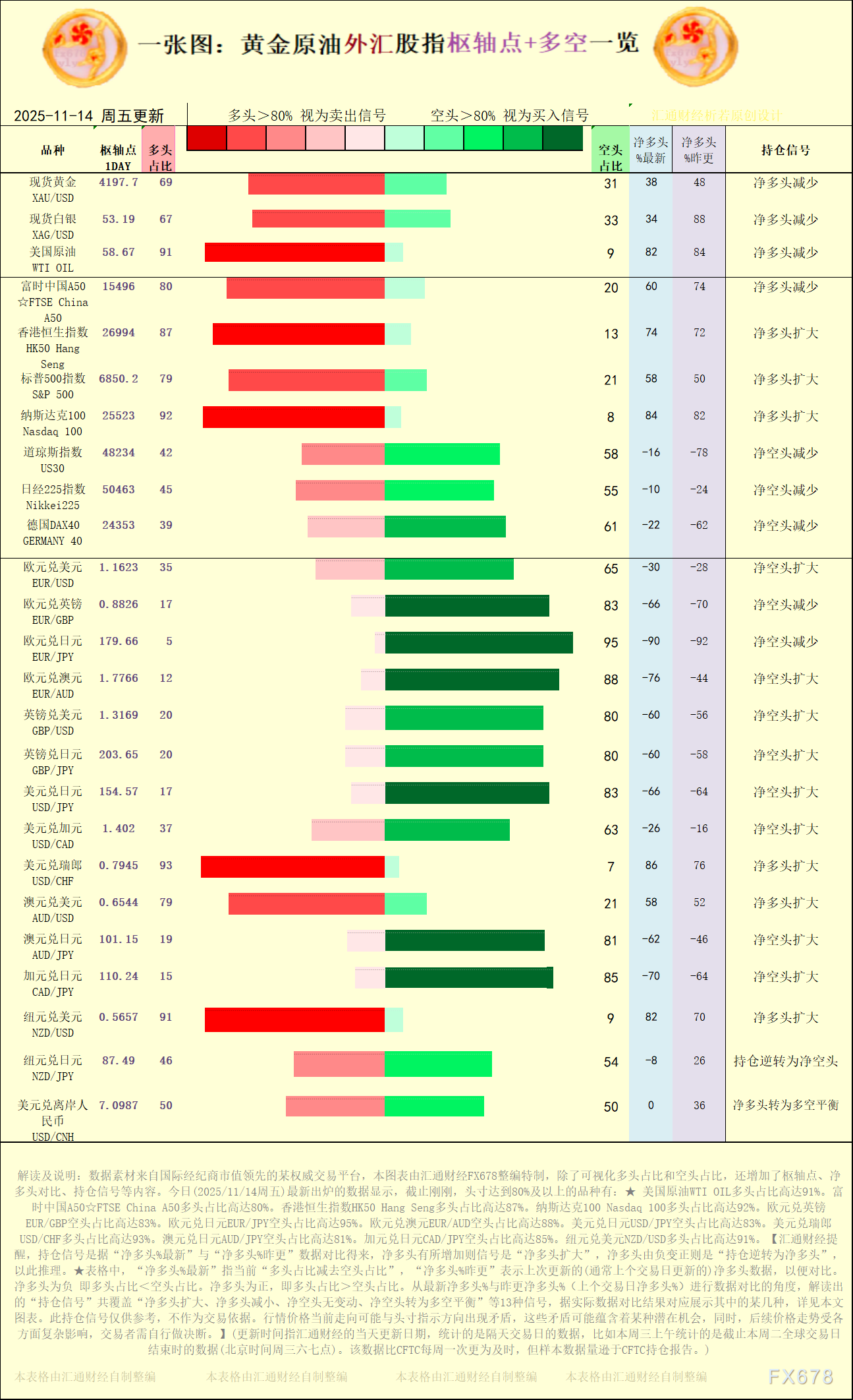 exapp下载:一张图:2025/11/14黄金原油外汇股指“枢纽点+多空持仓信号”一览